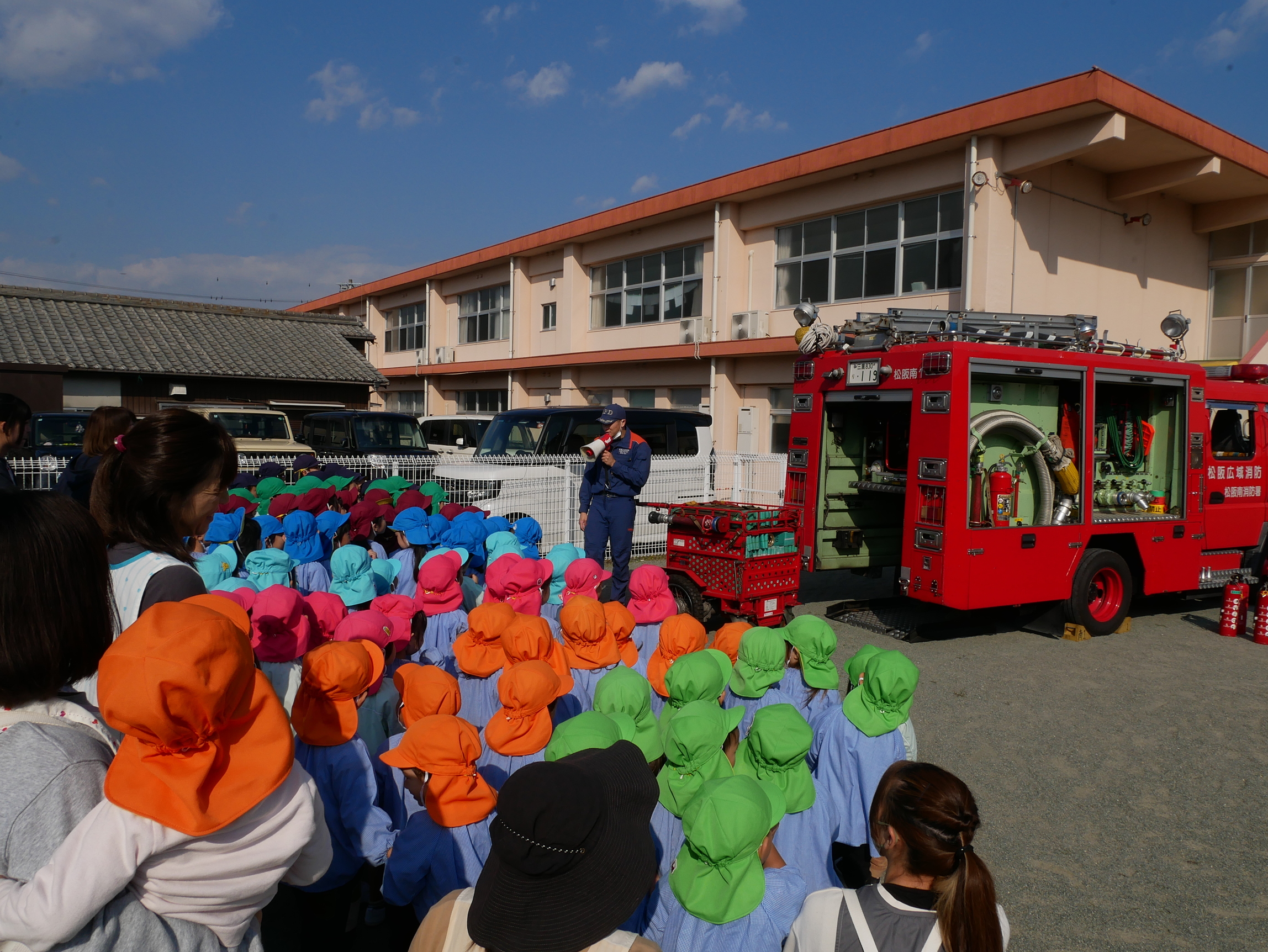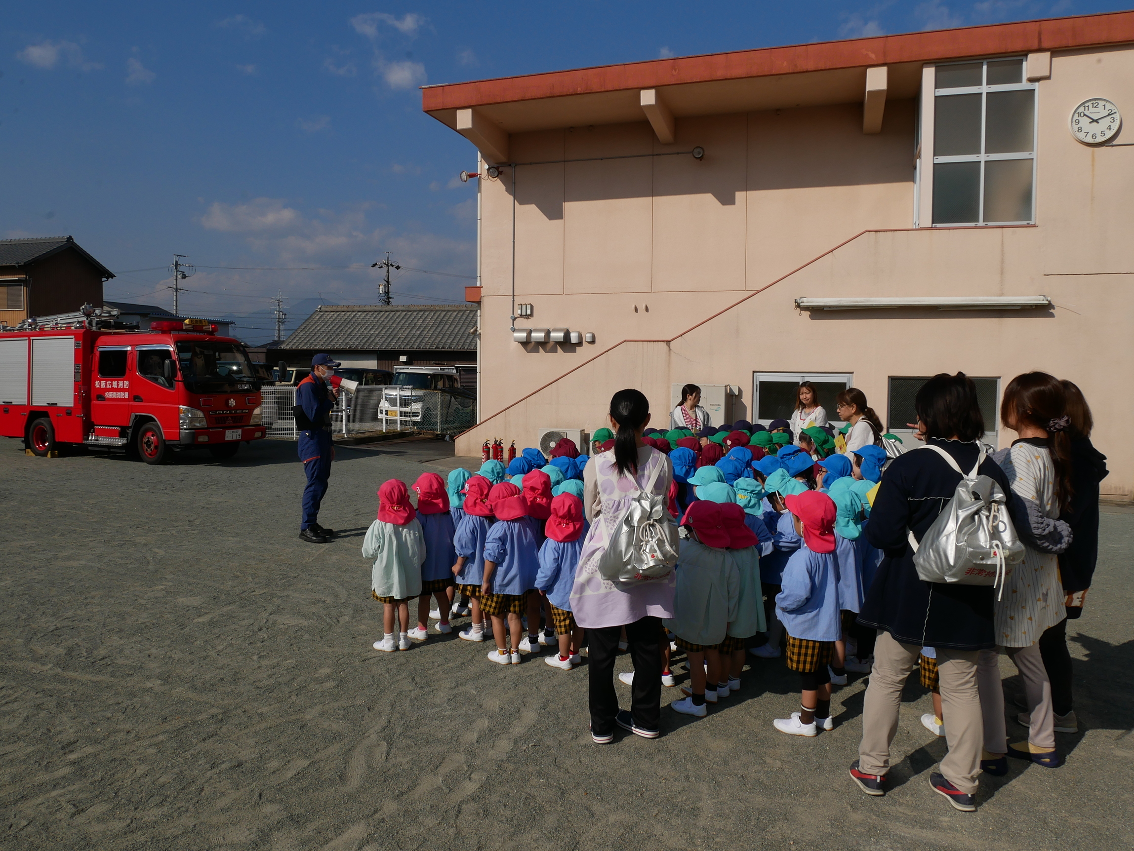 今日はつぼみ保育園で総合訓練がありました😊消防署から消防車と消防職員の方に来て頂いて、通報訓練や消火訓練を行いました✨